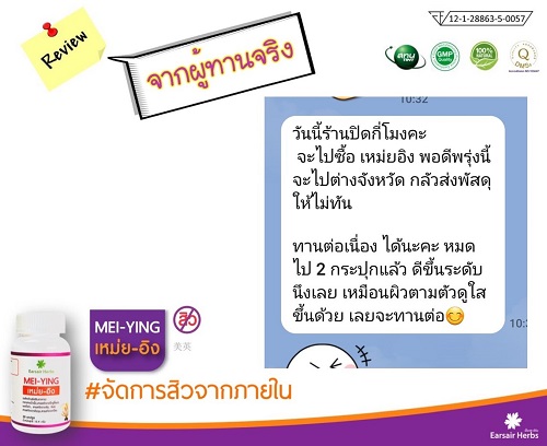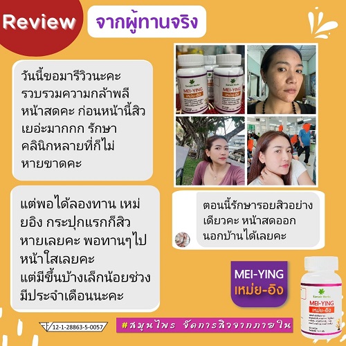 ผลิตภัณฑ์ เหม่ย-อิง เป็นสินค้าที่ผู้มีปัญหาเรื่องสิว ซื้อซ้ำกันมากที่สุดตัวหนึ่งของยอดที่สั่งซื้อตอนนี้มาก จากความไม่มั่นใจในตอนแรก จนกลายเป็นความเชื่อมั่น มากมาย