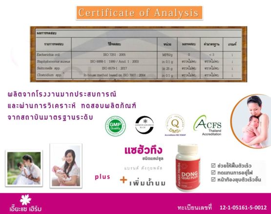 มั่นใจได้100% คือ ใช้วัตถุดิบที่เป็นสมุนไพรเกรด A พรีเมี่ยมแล้ว ยังมีการวิเคราะห์และทดสอบผลิตภัณฑ์ตัวอย่างจากห้องปฏิบัติการทดสอบที่ได้รับรองมาตรฐาน ISO/IEC1 7025 มีทะเบียนถูกต้อง (เลขที่ 12-1-28863-5-0051) ผลิตจากโรงงานมาตรฐาน